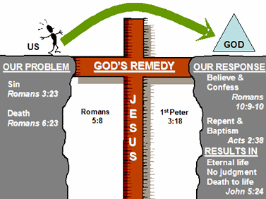 In the illustration above, the problem of sinfulness is clearly shown. There is a huge space between humanity and God. The bridge between the two is the cross; the life and sacrifice of Jesus restores us to our rightful place as God’s children.